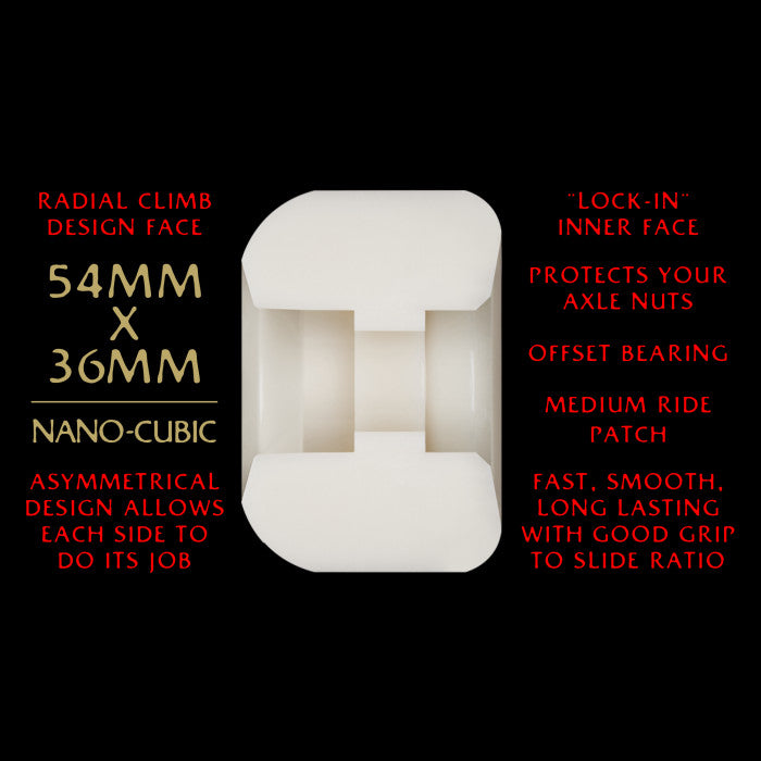 The Nano Cubic's offset design allows it to have the perfect shape for both inner and outer edges to skate a wider range of obstacles. Nano Cubics are smaller, lighter, and offset, so their large outer edge rolls up curbs, walls, and over cracks, and it covers your axle and nuts. The inner edge locks onto rails but releases when you need to.